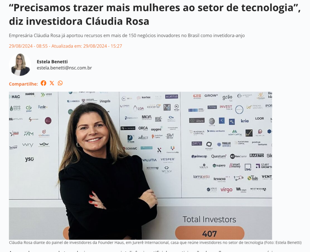 A Investidora Anjo mais influente do Brasil! Uma das maiores referências no mercado de Investimentos em Negócios. Prêmio Araucária Investidora 2024 Maior Investidora Anjo 2022 StartupAwards.